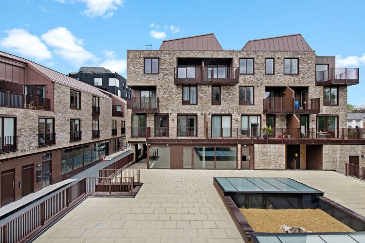 ‘Best Family Home over £1.5M’ winner at London Evening Standard New Homes Awards 2017. The project involved the demolition of a 1960’s industrial building and formation of a 5 storey commercial building, and 8 new 4 storey residential townhouse units on a tight site in Ravenscourt Park. The site is approx 17m x 55m long, boarded on 3 sides by existing buildings. There is a common basement under both buildings, utilised as a car park under the residential building and an office space under the commercial building, and formed in RC. The basement perimeter is formed in sheet piles driven through the sand and gravels into the underlying clay strata. At ground floor level within the residential building, large continuous RC downstand beams provide the clear widths for parking, and support the ground floor slab and upper level loadbearing walls. The residential superstructure above ground floor level is formed using load bearing solid blockwork walls which support steel and engineered timber joist floors. Perimeter walls are cavity blockwork. Both walls act as shear walls in both directions to resist lateral loads, with windposts used to strengthen piers between large perimeter window openings. Vertical movement joints are typically at 5.2m c/c’s on party wall lines. Balconies to the front, and large storey height openings to the rear of each units are formed in structural steelwork supported off the RC ground floor slab. The commercial superstructure is an RC flat slab frame with a timber frame roof. The rear of the building steps in as the building progresses upwards and the edge of the RC floor plates reflect this.