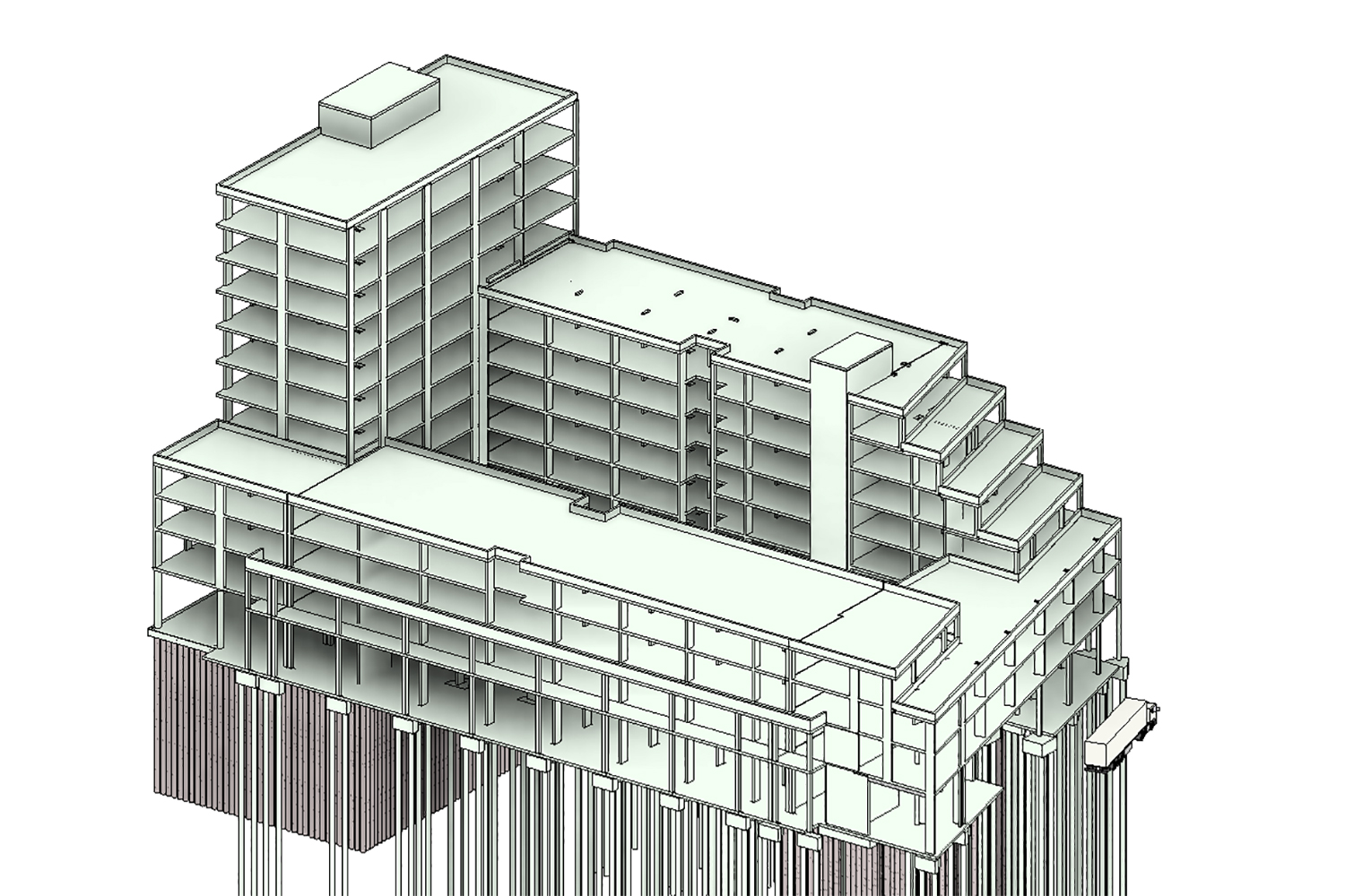 The proposed structure is an RC frame with flat slabs, to offer straightforward coordination for services within ceiling voids, while maximising available ceiling heights. This structural approach also ensures it is as adaptable as possible for future change of use or change of layouts.